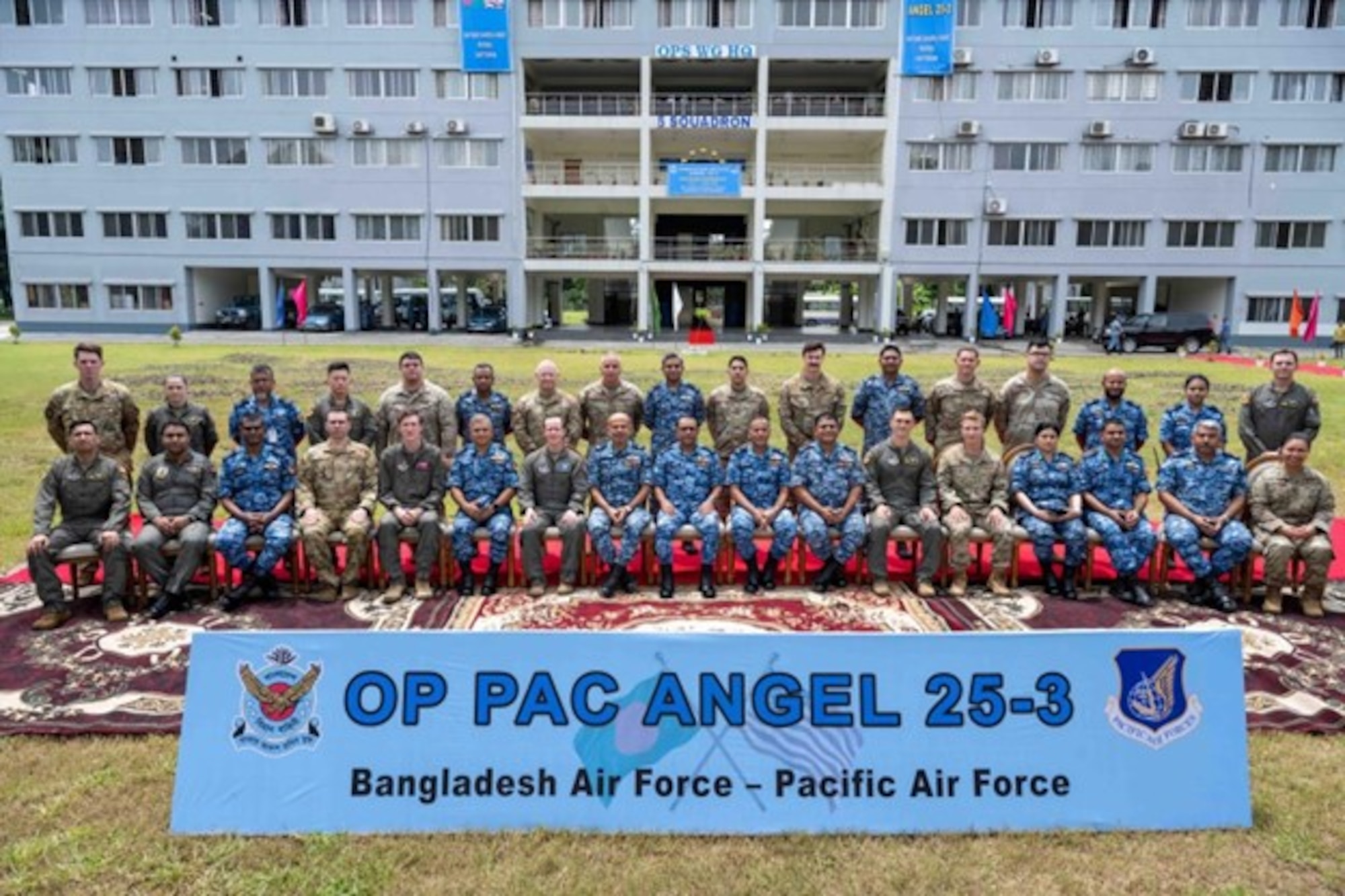 U.S. Air Force and Bangladesh Air Force participating in exercise Pacific Angel 25-3 sit and stand for a group photo at BAF Zahurul Haque, Chittagong, Bangladesh, Sept. 13, 2025. Pacific.
